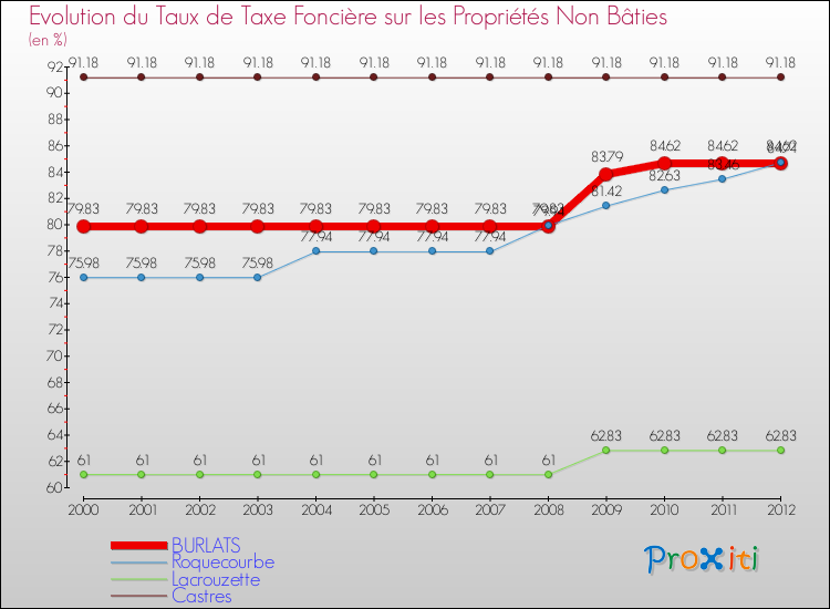 Pendant la même période, les communes françaises similaires à Burlats, ont vu leur taux de taxe foncière sur le non bâti augmenter de 14.97 % en moyenne entre 2000 et 2012.