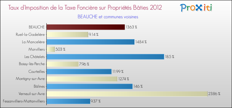 En 2012, le taux de la taxe foncière sur le bâti vôté par le conseil municipal de Beauche était de : 13.63 %.