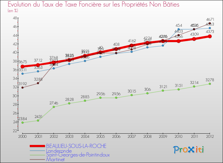 Pendant la même période, les communes françaises similaires à Beaulieu-sous-la-Roche, ont vu leur taux de taxe foncière sur le non bâti augmenter de 29.14 % en moyenne entre 2000 et 2012.