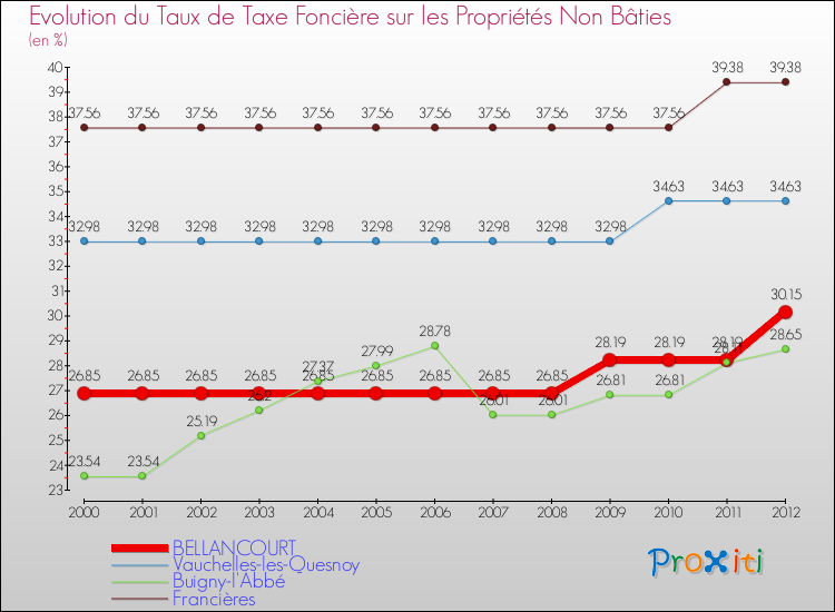 En 2012, le taux de la taxe foncière sur le non bâti vôté par le conseil municipal de Bellancourt était de : 30.15 %.