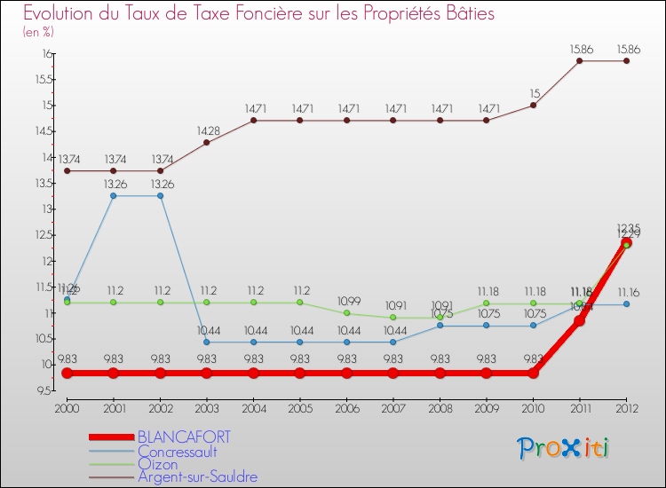En 2012, le taux de la taxe foncière sur le bâti vôté par le conseil municipal de Blancafort était de : 12.35 %.