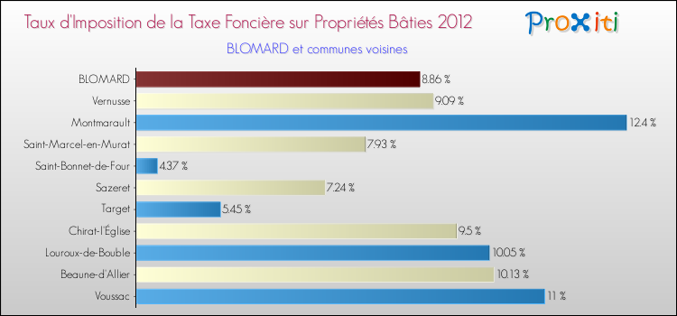 A noter : la valeur moyenne de ce taux de taxe foncière sur le bâti dans les communes françaises similaires à Blomard était de 10.09 %, en 2012.