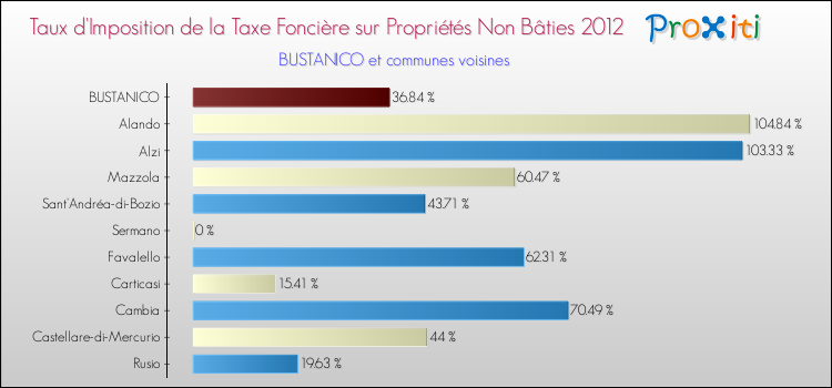 En 2012, le taux de la taxe foncière sur le non bâti vôté par le conseil municipal de Bustanico était de : 36.84 %.