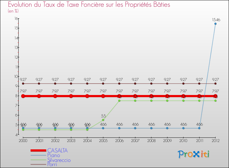 A Casalta, le taux de taxe foncière sur le bâti a donc augmenté de 0 % entre 2000 et 2012.