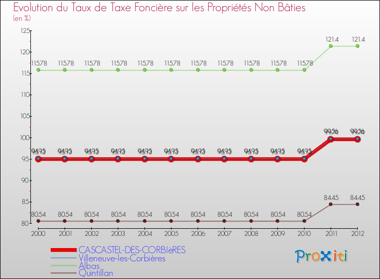 A Cascastel-des-Corbières, le taux de taxe foncière sur le non bâti a donc augmenté de 4.86 % entre 2000 et 2012.
