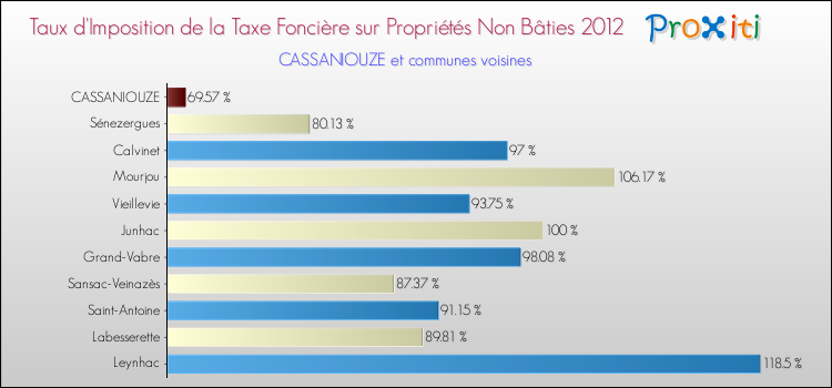 En 2012, le taux de la taxe foncière sur le non bâti vôté par le conseil municipal de Cassaniouze était de : 69.57 %.