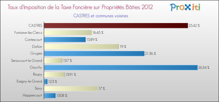 En 2012, le taux de la taxe foncière sur le bâti vôté par le conseil municipal de Castres était de : 25.42 %.