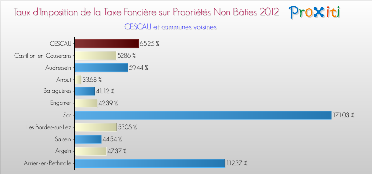 En 2012, le taux de la taxe foncière sur le non bâti vôté par le conseil municipal de Cescau était de : 65.25 %.