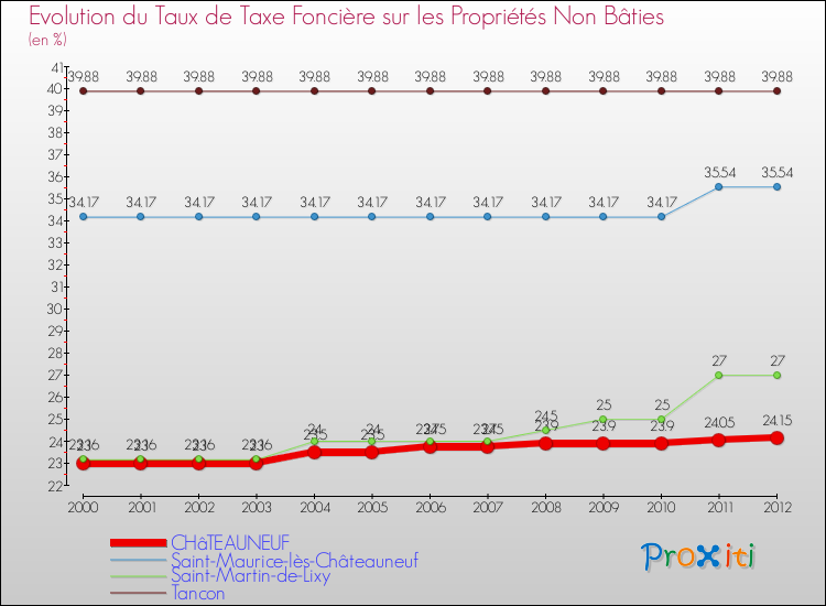 Pendant la même période, les communes françaises similaires à Châteauneuf, ont vu leur taux de taxe foncière sur le non bâti augmenter de 48.39 % en moyenne entre 2000 et 2012.