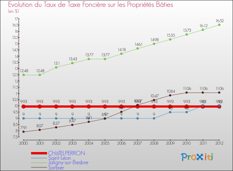 A Châtelperron, le taux de taxe foncière sur le bâti a donc augmenté de 0 % entre 2000 et 2012.