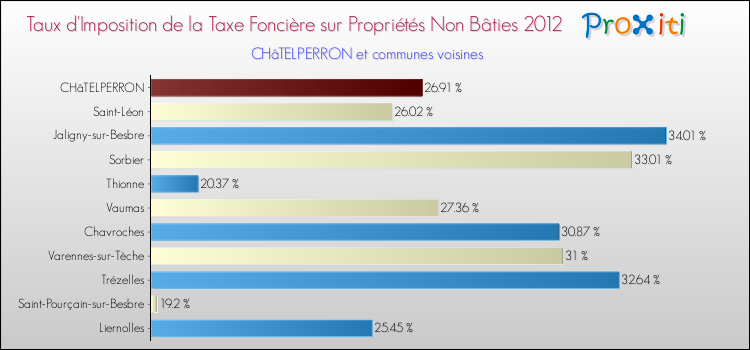 En 2012, le taux de la taxe foncière sur le non bâti vôté par le conseil municipal de Châtelperron était de : 26.91 %.