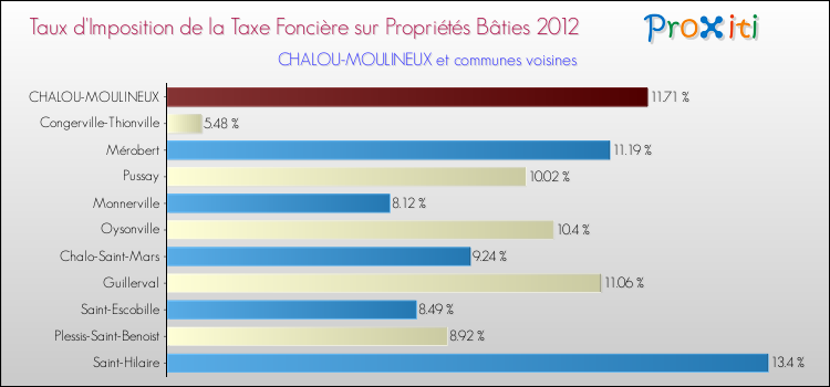En 2012, le taux de la taxe foncière sur le bâti vôté par le conseil municipal de Chalou-Moulineux était de : 11.71 %.
