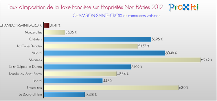 Vous trouverez ci-dessous des graphiques qui vous permettent de situer le taux de la taxe foncière sur le non bâti de Chambon-Sainte-Croix par rapport aux communes voisines.