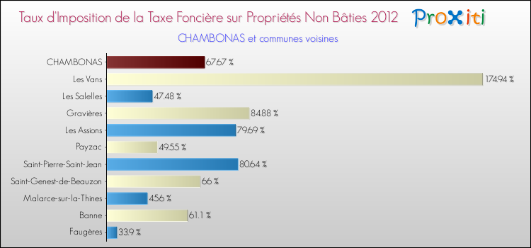En 2012, le taux de la taxe foncière sur le non bâti vôté par le conseil municipal de Chambonas était de : 67.67 %.