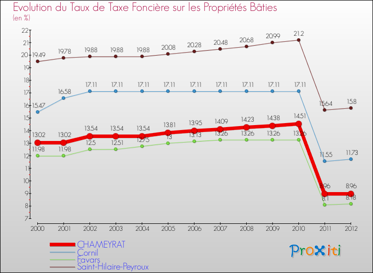 Pendant la même période, les communes françaises similaires à Chameyrat, ont vu leur taux de taxe foncière sur le bâti augmenter de 22.76 % en moyenne entre 2000 et 2012.