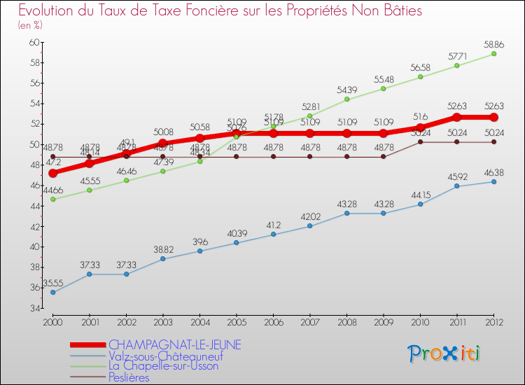 Pendant la même période, les communes françaises similaires à Champagnat-le-Jeune, ont vu leur taux de taxe foncière sur le non bâti augmenter de 25.51 % en moyenne entre 2000 et 2012.