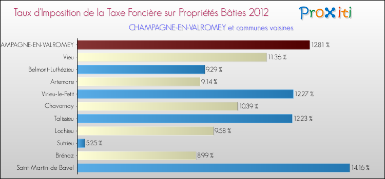 En 2012, le taux de la taxe foncière sur le bâti vôté par le conseil municipal de Champagne-en-Valromey était de : 12.81 %.