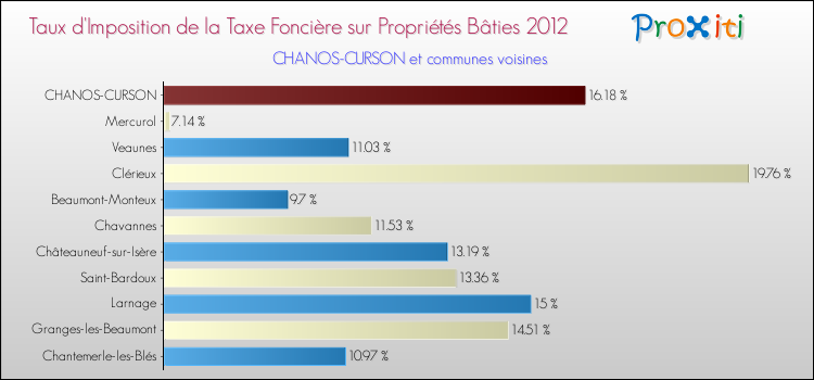En 2012, le taux de la taxe foncière sur le bâti vôté par le conseil municipal de Chanos-Curson était de : 16.18 %.