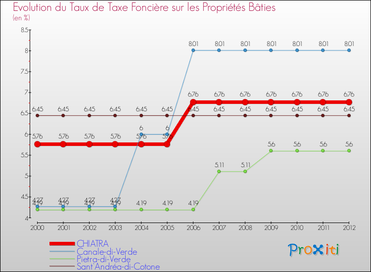 En 2012, le taux de la taxe foncière sur le bâti vôté par le conseil municipal de Chiatra était de : 6.76 %.