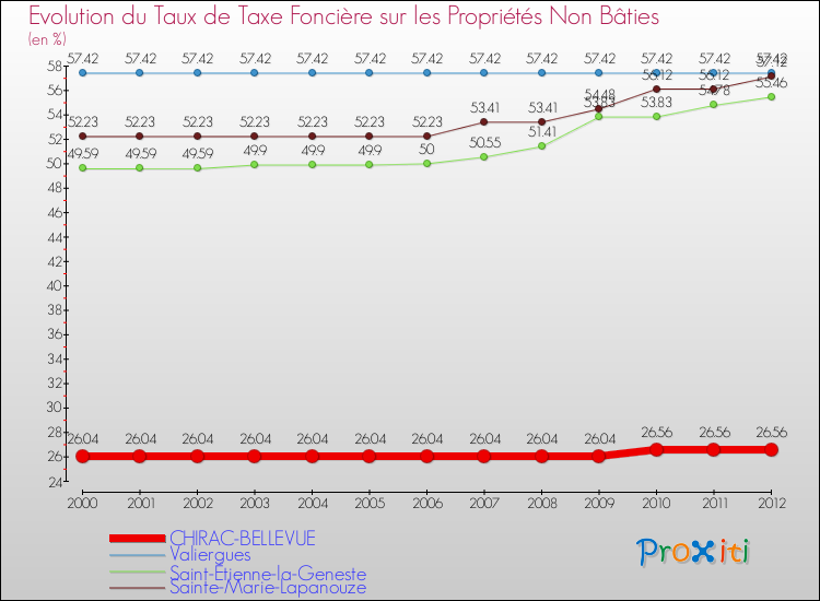 En 2012, le taux de la taxe foncière sur le non bâti vôté par le conseil municipal de Chirac-Bellevue était de : 26.56 %.