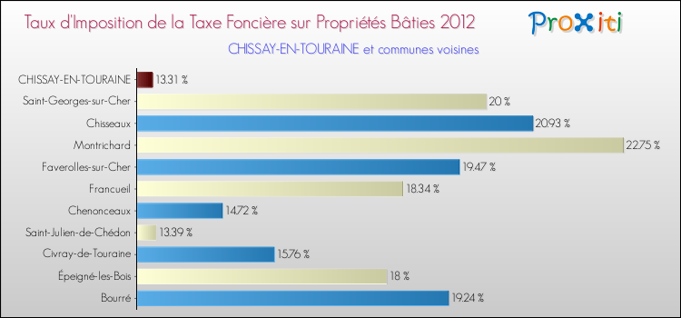 En 2012, le taux de la taxe foncière sur le bâti vôté par le conseil municipal de Chissay-en-Touraine était de : 13.31 %.
