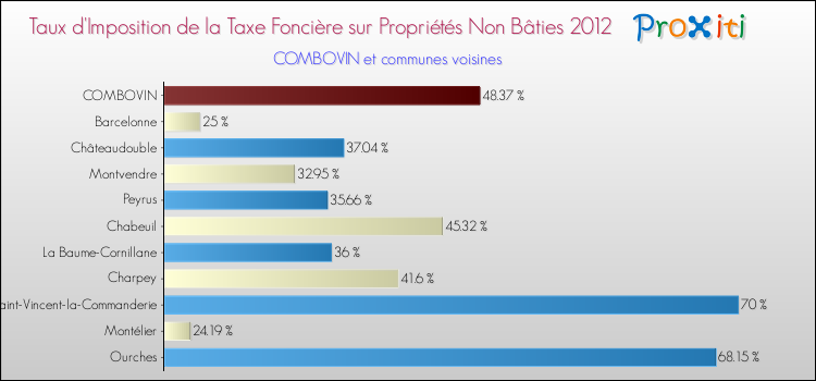 En 2012, le taux de la taxe foncière sur le non bâti vôté par le conseil municipal de Combovin était de : 48.37 %.