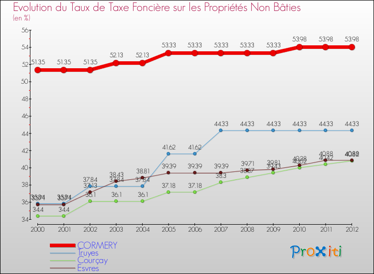 Pendant la même période, les communes françaises similaires à Cormery, ont vu leur taux de taxe foncière sur le non bâti augmenter de 14.97 % en moyenne entre 2000 et 2012.