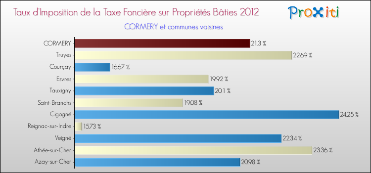 Pendant la même période, les communes françaises similaires à Cormery, ont vu leur taux de taxe foncière sur le bâti augmenter de 18.78 % en moyenne entre 2000 et 2012.