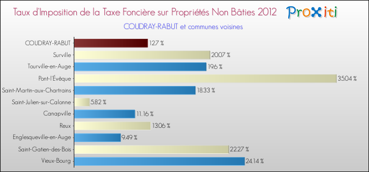 Vous trouverez ci-dessous des graphiques qui vous permettent de situer le taux de la taxe foncière sur le non bâti de Coudray-Rabut par rapport aux communes voisines.