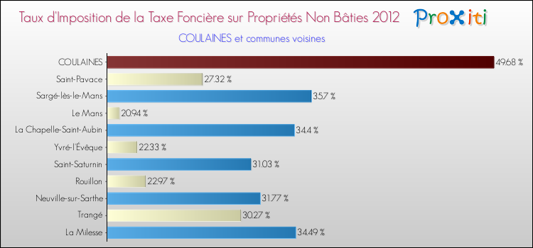 En 2012, le taux de la taxe foncière sur le non bâti vôté par le conseil municipal de Coulaines était de : 49.68 %.