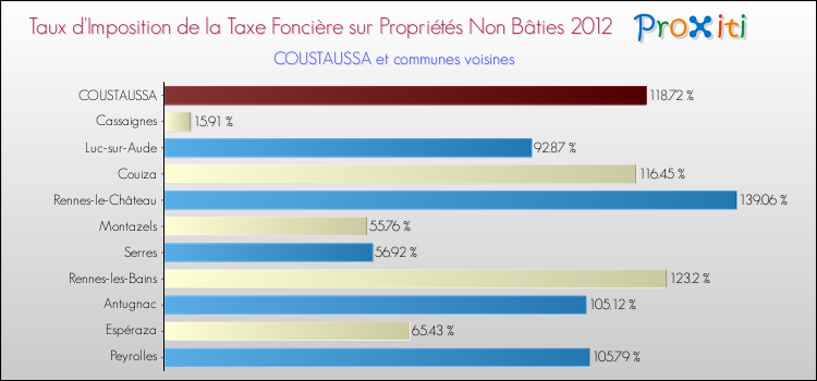 En 2012, le taux de la taxe foncière sur le non bâti vôté par le conseil municipal de Coustaussa était de : 118.72 %.