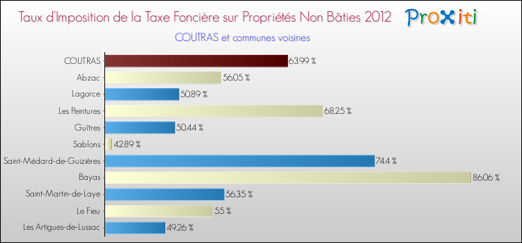 En 2012, le taux de la taxe foncière sur le non bâti vôté par le conseil municipal de Coutras était de : 63.99 %.