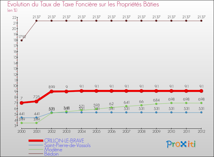 A Crillon-le-Brave, le taux de taxe foncière sur le bâti a donc augmenté de 30 % entre 2000 et 2012.