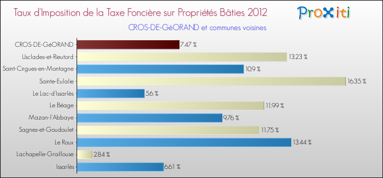 En 2012, le taux de la taxe foncière sur le bâti vôté par le conseil municipal de Cros-de-Géorand était de : 7.47 %.