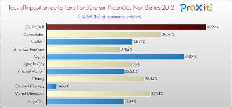 En 2012, le taux de la taxe foncière sur le non bâti vôté par le conseil municipal de Caumont était de : 47.99 %.