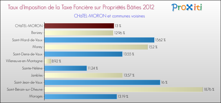 En 2012, le taux de la taxe foncière sur le bâti vôté par le conseil municipal de Châtel-Moron était de : 13 %.