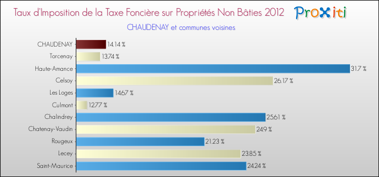 En 2012, le taux de la taxe foncière sur le non bâti vôté par le conseil municipal de Chaudenay était de : 14.14 %.