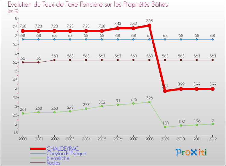 En 2012, le taux de la taxe foncière sur le bâti vôté par le conseil municipal de Chaudeyrac était de : 3.99 %.