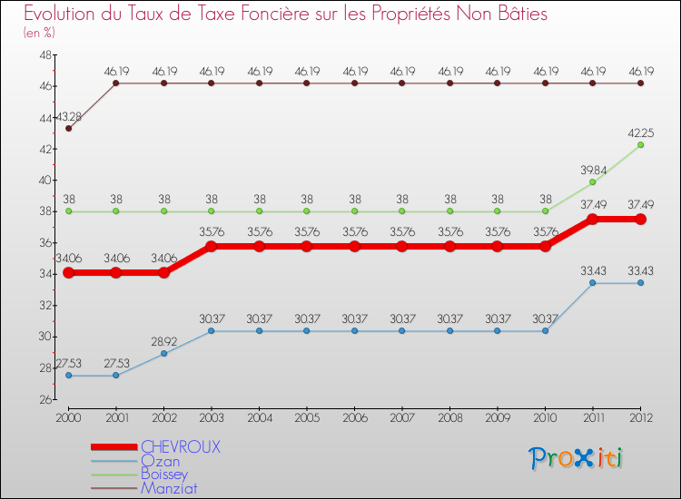 A Chevroux, le taux de taxe foncière sur le non bâti a donc augmenté de 10.07 % entre 2000 et 2012.