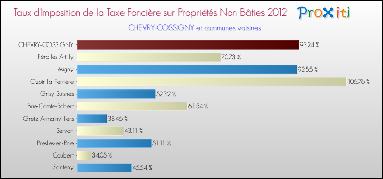 En 2012, le taux de la taxe foncière sur le non bâti vôté par le conseil municipal de Chevry-Cossigny était de : 93.24 %.