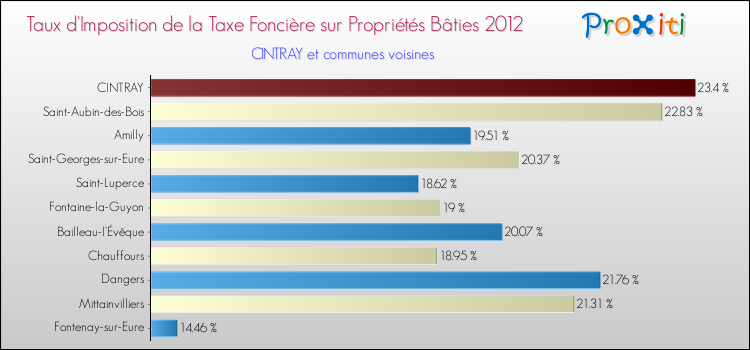 En 2012, le taux de la taxe foncière sur le bâti vôté par le conseil municipal de Cintray était de : 23.4 %.