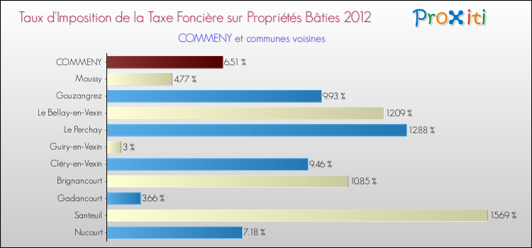 Vous trouverez ci-dessous des graphiques qui vous permettent de situer le taux de la taxe foncière sur le bâti de Commeny par rapport aux communes voisines.