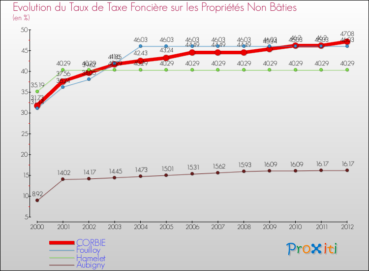 En 2012, le taux de la taxe foncière sur le non bâti vôté par le conseil municipal de Corbie était de : 47.08 %.