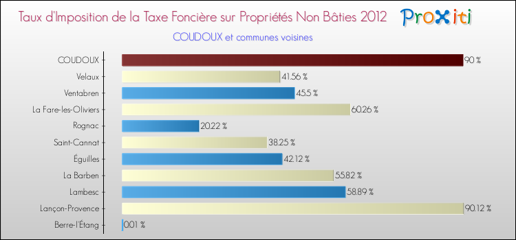 Comparaison des taux d'imposition de la taxe foncière sur les immeubles et terrains non batis 2012 pour COUDOUX et les communes voisines