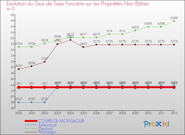 A Cours-de-Monségur, le taux de taxe foncière sur le non bâti a donc augmenté de 0 % entre 2000 et 2012.