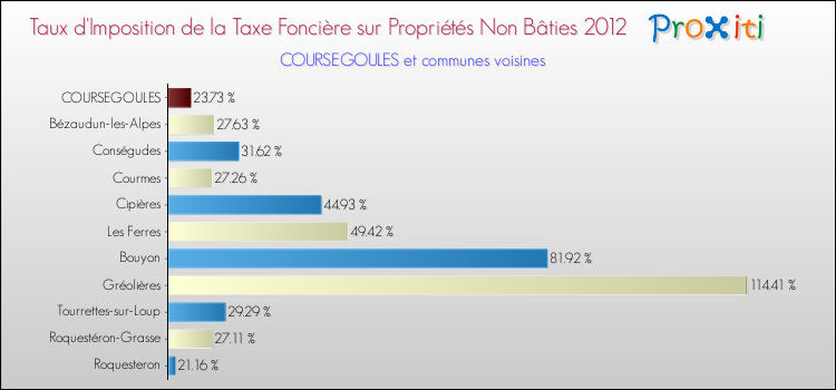 En 2012, le taux de la taxe foncière sur le non bâti vôté par le conseil municipal de Coursegoules était de : 23.73 %.