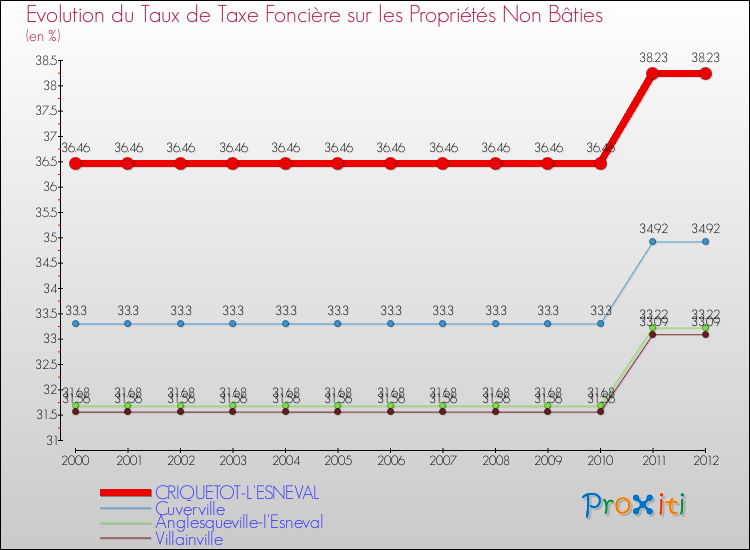 A Criquetot-l'Esneval, le taux de taxe foncière sur le non bâti a donc augmenté de 4.85 % entre 2000 et 2012.