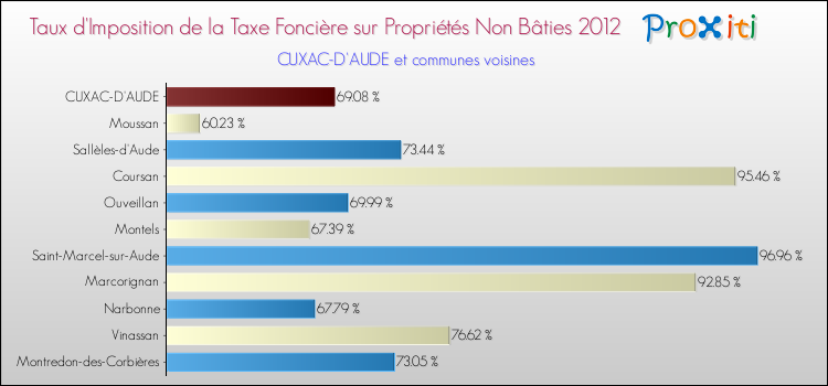 En 2012, le taux de la taxe foncière sur le non bâti vôté par le conseil municipal de Cuxac-d'Aude était de : 69.08 %.
