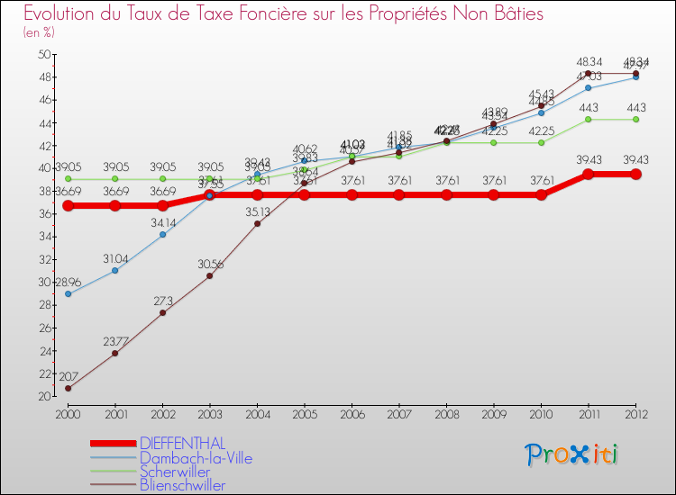 Pendant la même période, les communes françaises similaires à Dieffenthal, ont vu leur taux de taxe foncière sur le non bâti augmenter de 16.95 % en moyenne entre 2000 et 2012.