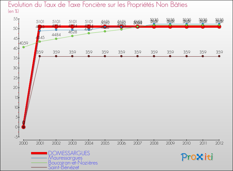 A Domessargues, le taux de taxe foncière sur le non bâti a donc augmenté de 0 % entre 2000 et 2012.